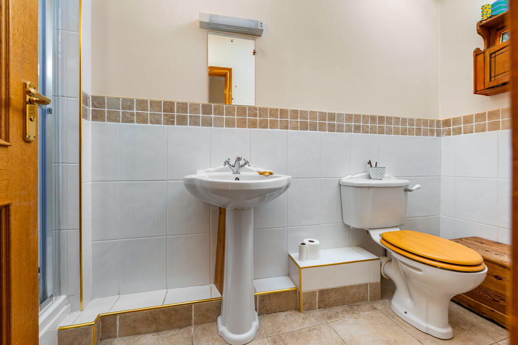 DOWNSTAIRSWC Tiled flooring. WC. Pedestal wash hand basin with hot and cold tap over. Pendant light fitting.