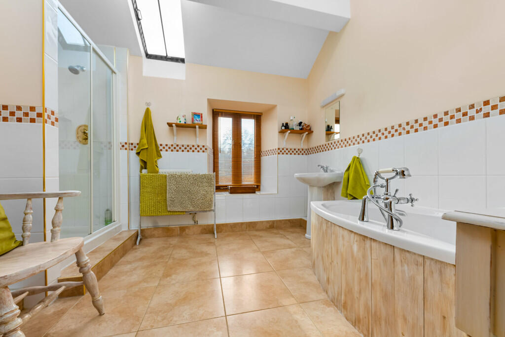 BATHROOM11' 1" x 9' 10" (3.40m x 3.00m) Tiled flooring and partially tiled walls. Window with additional Velux window to ceiling. Panelled bath with hot and cold tap over and additional handheld shower attachment. Pedestal wash hand basin with hot and cold tap over. Walk in shower cubicle with mains powered shower over. Radiator.