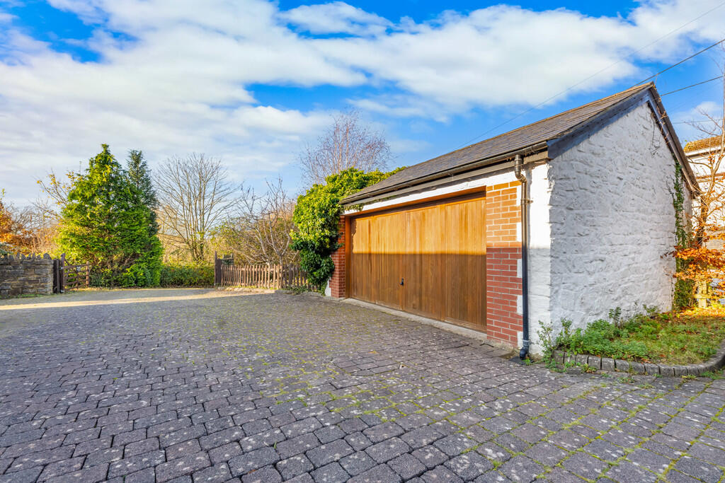 FRONT Gated entrance to spacious driveway with ample parking. Detached double garage. Access to rear garden.