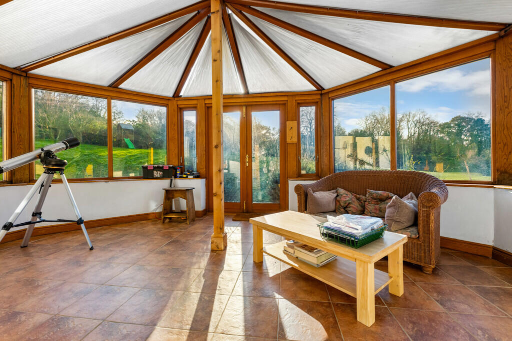 CONSERVATORY Large conservatory. Tiled flooring. Panoramic windows with additional French doors leading to rear garden.