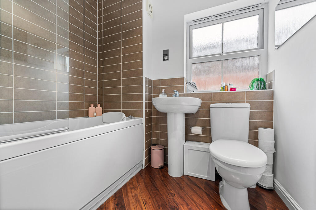 FAMILYBATHROOM6' 8" x 6' 7" (2.04m x 2.02m) Quality white suite comprising low level wc, wash hand basin, jacuzzi bath with multi jets and shower mixer tap, additional shower above, swivel shower screen, quality karndean flooring, obscure glass window, extractor fan and chrome heated towel rail.