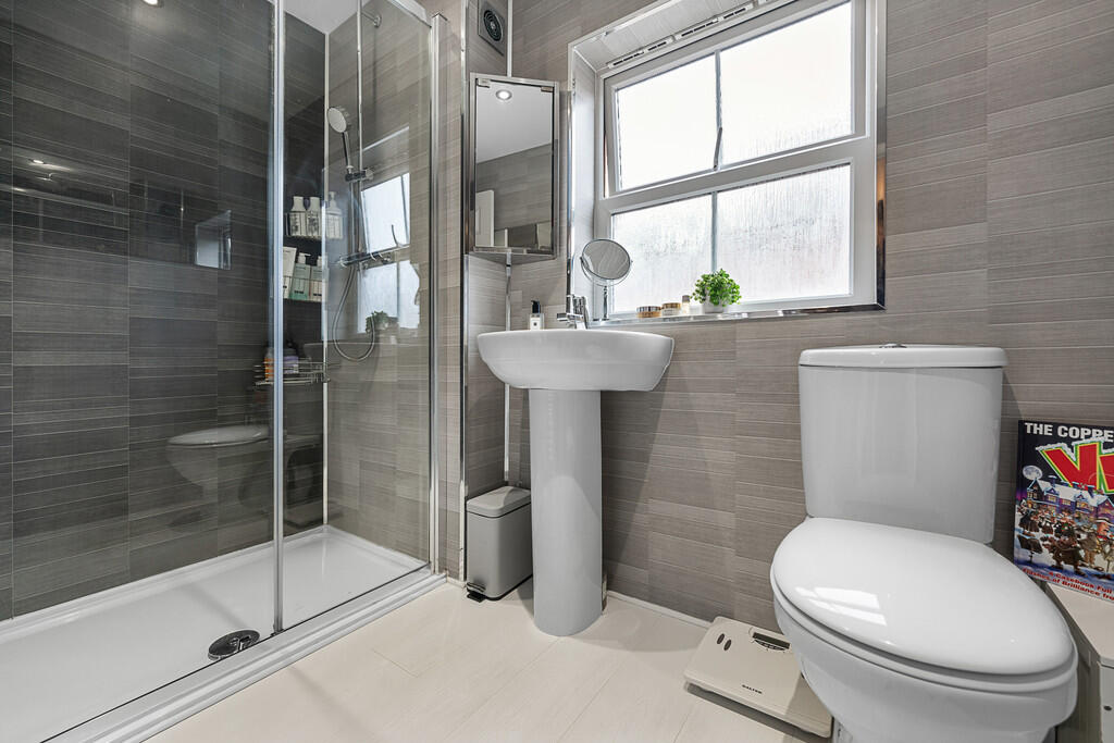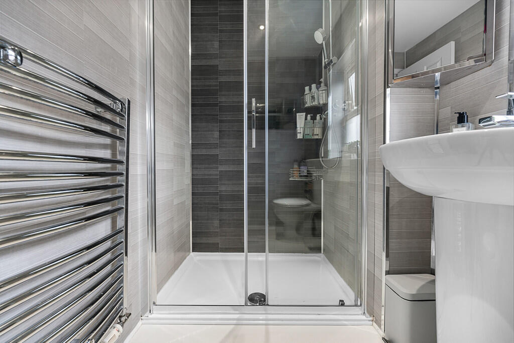 ENSUITESHOWERROOM Modern white suite comprising low level wc, wash hand basin, double width shower cubicle with twin head chrome shower, acrylic wall splashback throughout, obscure glass window, recessed spotlights, extractor fan and chrome heated towel rail.