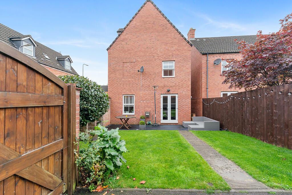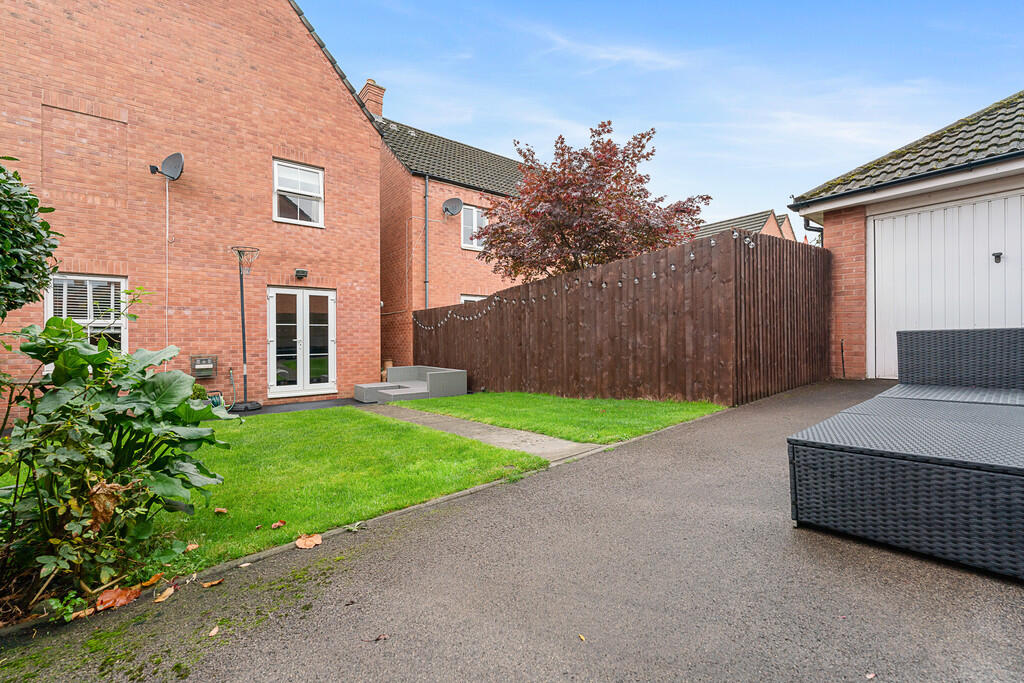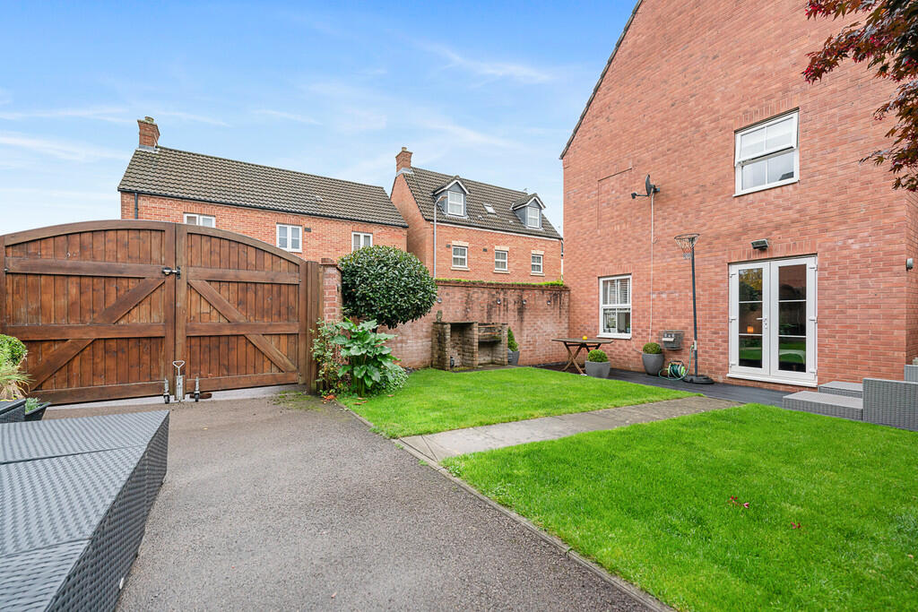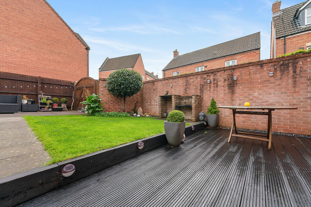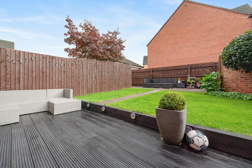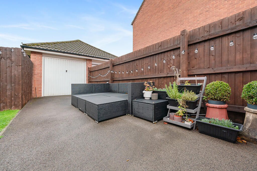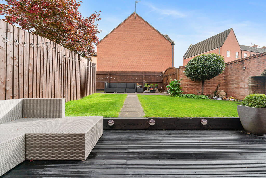 GARDEN A delightful rear garden comprising decked relaxation leading onto a well manicured area of lawn with inset plants and shrubs to borders, driveway to rear access via double opening timber gates leading to the garage.