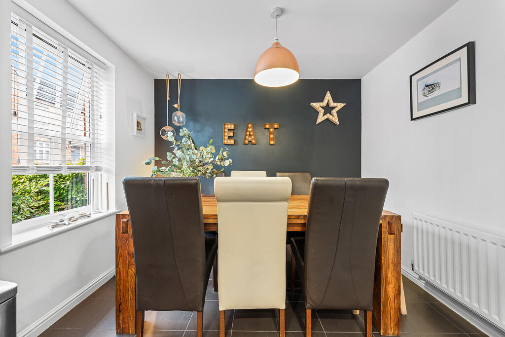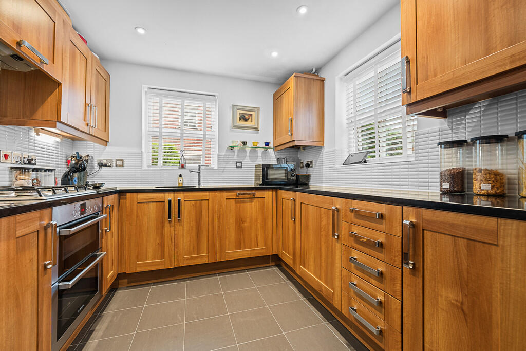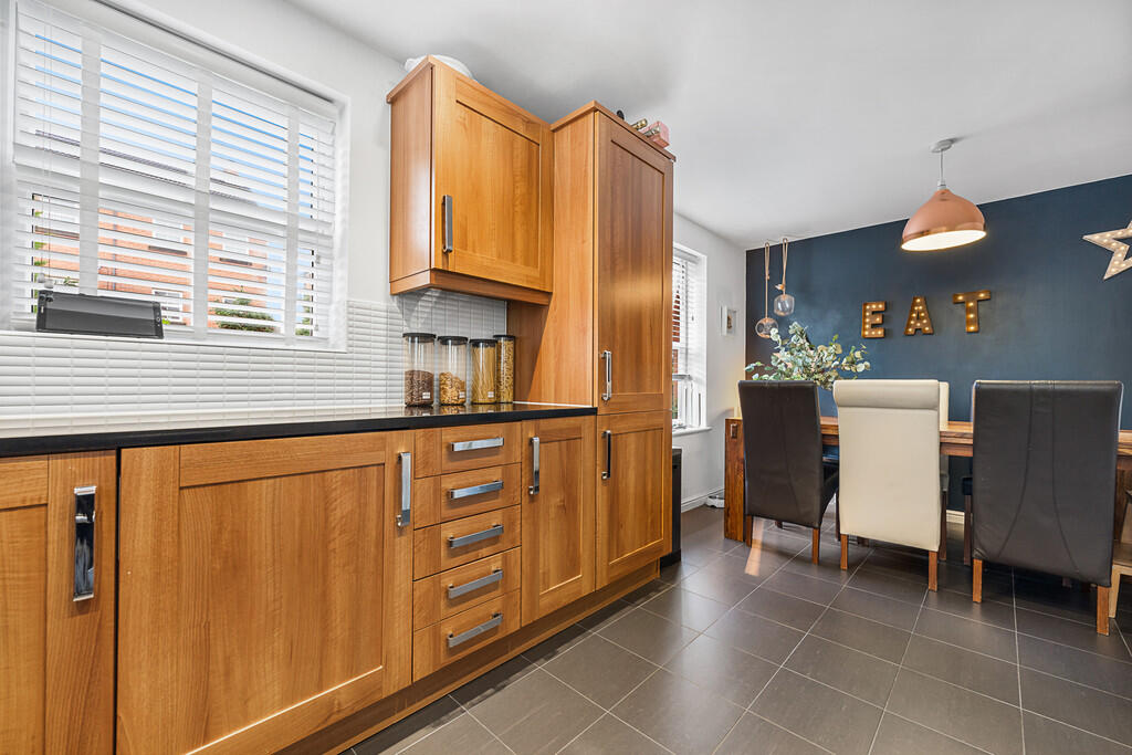 KITCHENANDDINER17' 9" x 9' 6" (5.42m x 2.91m) Modern fitted kitchen well appointed along three sides in wood grain effect panelled fronts with chrome handles beneath granite worktop surfaces, integrated dishwasher, integrated fridge freezer, inset sink with matching worktop side drainer, inset four ring gas hob with concealed cooker hood above, integrated oven below, integrated washing machine, matching range of eye level wall cupboards, concealed Worcester gas central heating boiler (approx 2 years old), wall tiling to splash back areas, ample space for large family dining table, windows to front and side, recessed spotlights to kitchen area, quality tiled flooring and radiator.