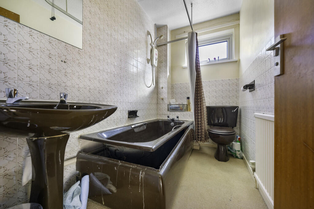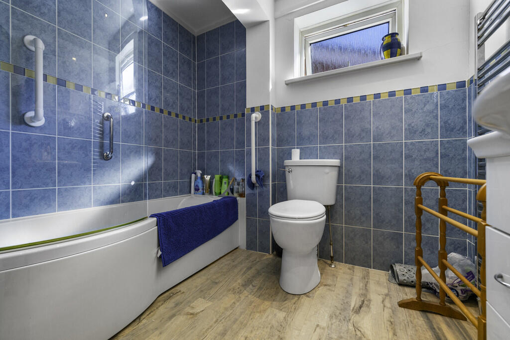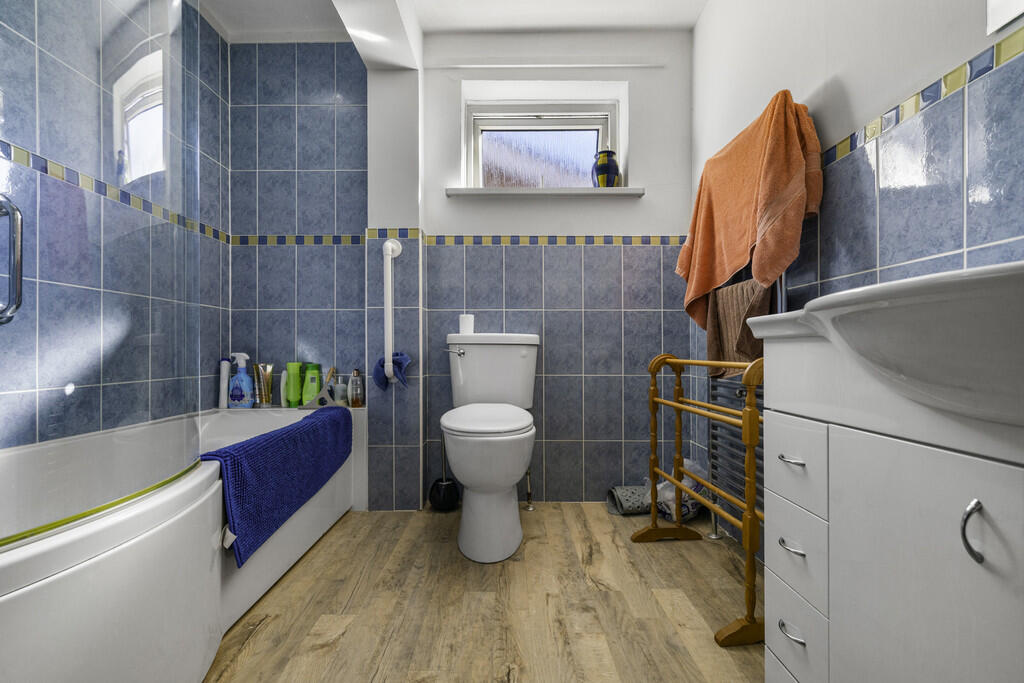 FAMILYBATHROOM8' 6" x 7' 9" (2.60m x 2.38m) White suite comprising low level wc, vanity wash basin with storage below, p-shaped bath with shower above and swivel shower screen. Wall tiling to splash back areas. Obscured glass window to side. Recessed spotlights. Chrome heated towel rail.