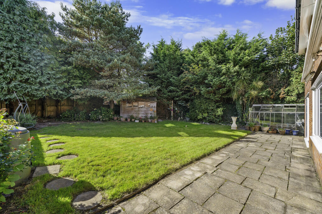 FRONTGARDEN Large lawned front garden with inset plants and shrubs. Wide and long driveway. Paved pathway to front door. Gate access to rear garden via either side.