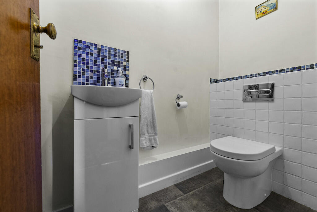 CLOAKROOM Modern white suite comprising low level wc, vanity wash basin with storage below. Window to side. Tiled splash back. Radiator.