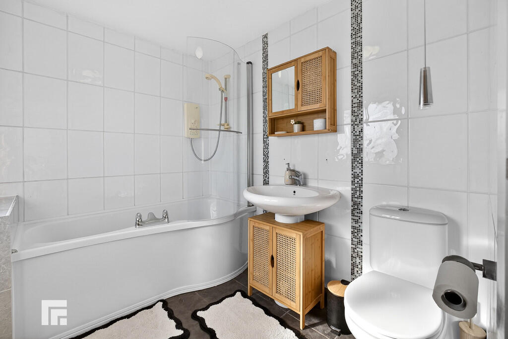 BATHROOM7' 7" x 6' 9" (2.32m x 2.08m) Obscure double glazed uPVC windows to rear aspect. Tired flooring. Fully tiled walls. Panelled bath with shower over and glass shower screen. Pedestal wash hand basin. W.C. Extractor. Heated towel rail.