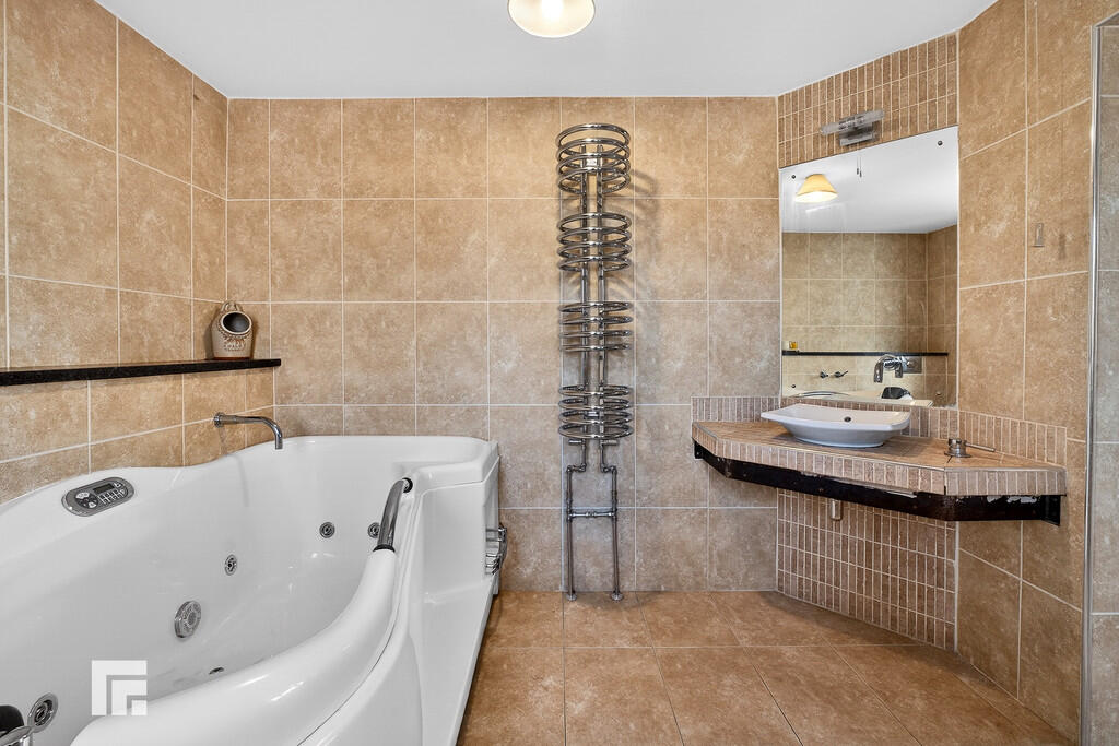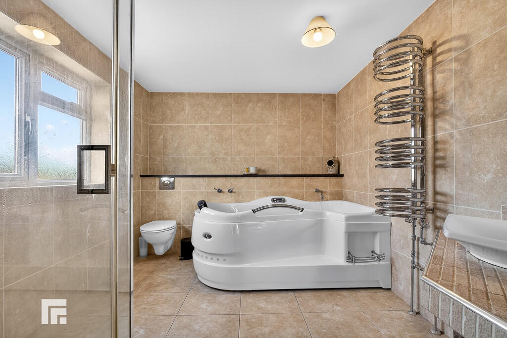 EN-SUITE9' 4" x 8' 9" (2.87m x 2.67m) Large en-suite. Obscure double glazed uPVC windows to side aspect. Tiled flooring. Fully tiled walls. Jacuzzi bath. Separate shower cubicle. Wash hand basin with mirror and lighting over. W.C. Extractor. Heated spiral towel rail.