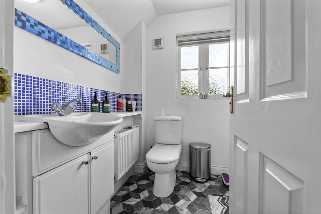 FAMILYSHOWERROOM White suite comprising low level wc, vanity wash basin with storage below, shower cubicle. Obscured glass window to rear. Electric shaver point. Mosaic style tiled splash back. Extractor fan. Radiator.