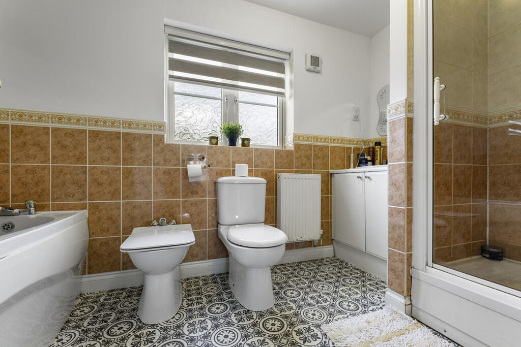 ENSUITESHOWERROOMTWO White suite comprising low level wc, wash hand basin, shower cubicle. Obscured glass window to front. Tiled splash back. Electric shaver point. Extractor fan. Radiator.