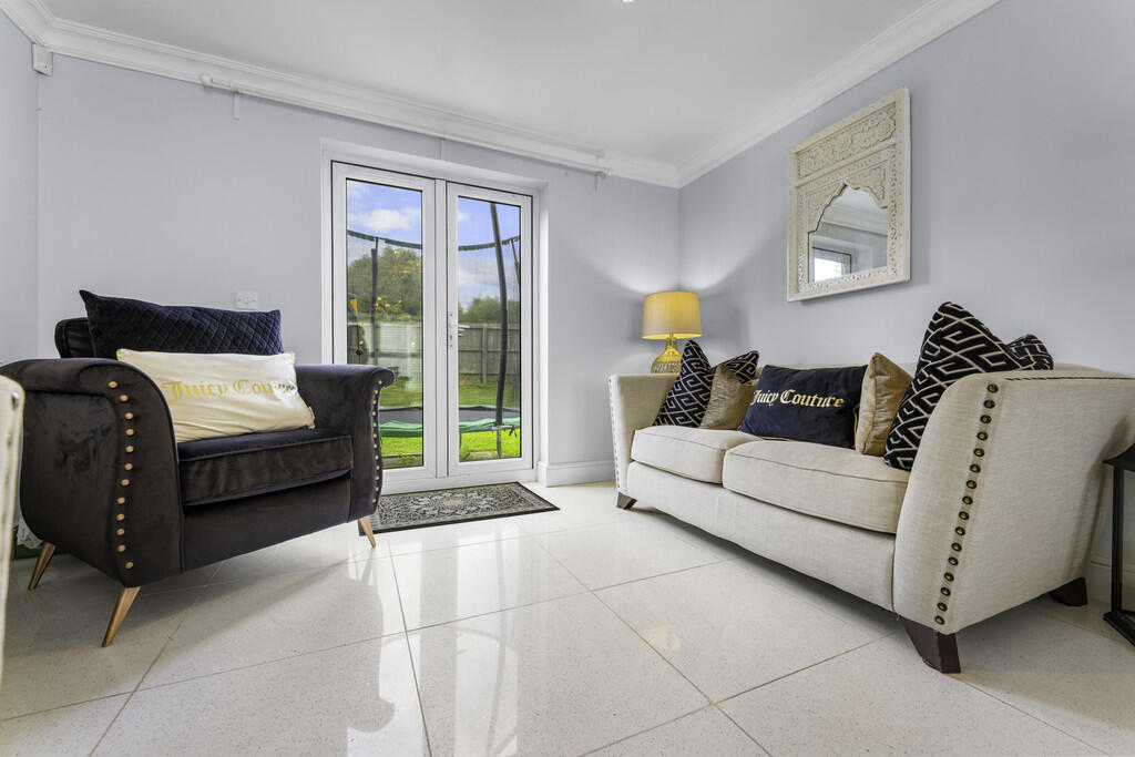 LOUNGE23' 7" x 11' 6" (7.21m x 3.53 (INTO BAY)m) An excellent sized reception with bay fronted window. French doors to the rear garden. Feature fireplace. Tiled flooring. Radiator.