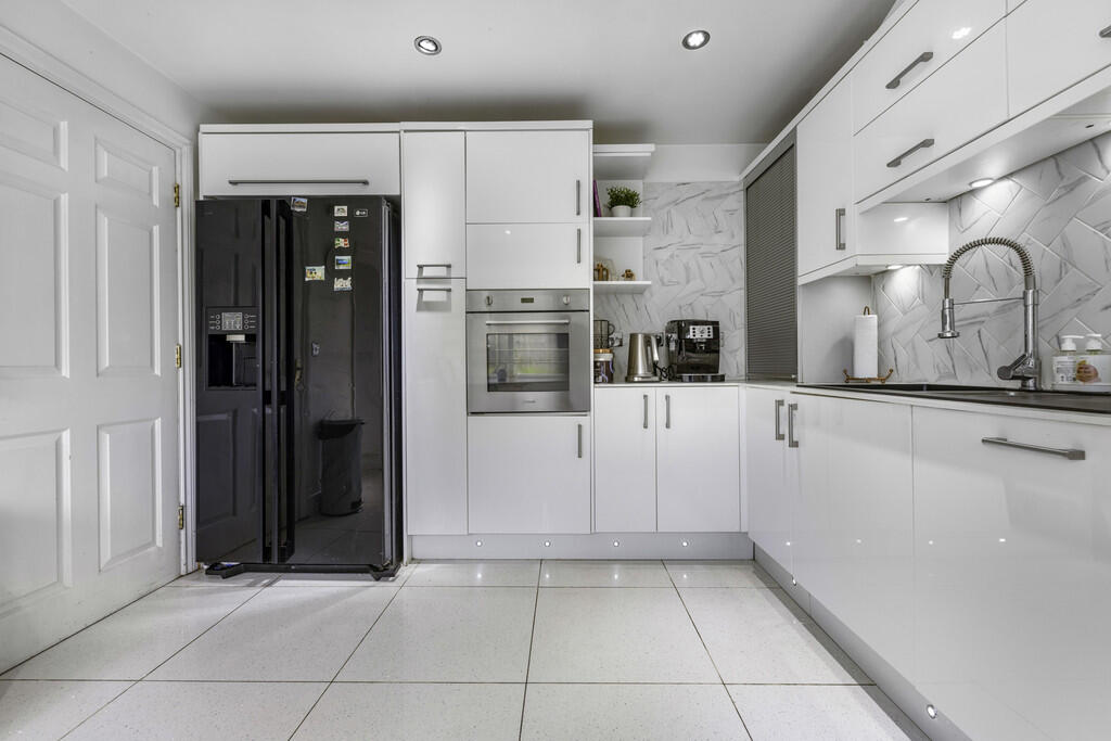 KITCHENANDBREAKFASTROOM14' 1" x 10' 7" (4.30m x 3.24m) Appointed along two sides in high gloss white fronts beneath slim line laminate worktop surface. Inset 1.5 bowl with side drainer. Inset five ring gas hob with cooker hood above. Integrated oven. Matching range of eye level wall cupboards. Space for American style fridge freezer. Bay window overlooking the rear garden. Recessed spotlights. Radiator. Door to utility room.