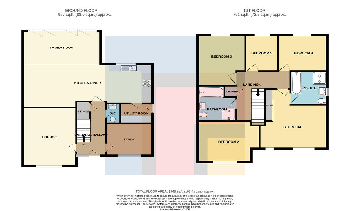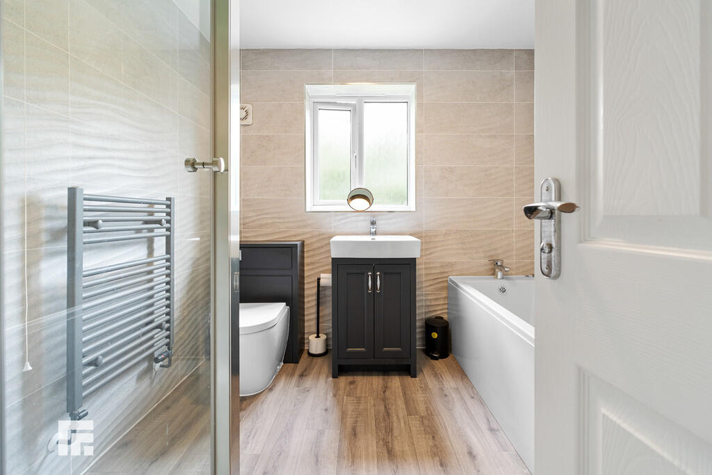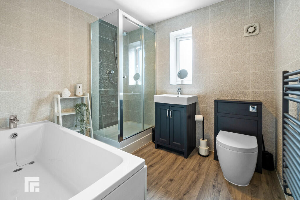 FAMILYBATHROOM8' 0" x 8' 0" (max)(2.46m x 2.46m) An upgraded suite comprising low level WC, vanity enclosed wash hand basin, panelled bath and fitted shower cubicle. Fully tiled walls. LVT flooring. Ladder radiator. uPVC double glazed window to side. Extractor fan.