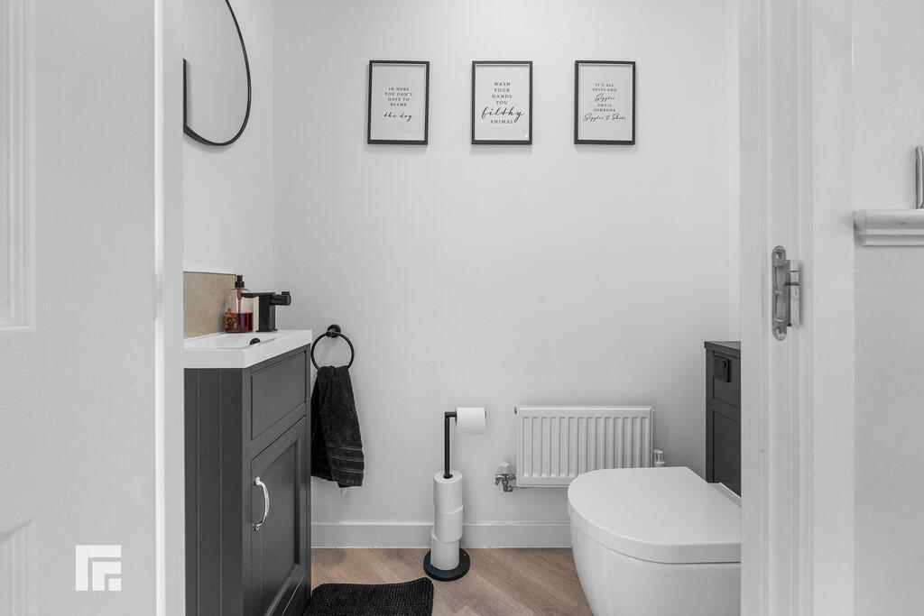 CLOAKROOM5' 10" x 3' 0" (1.78m x 0.93m) Modern low level WC and vanity enclosed wash hand basin. Radiator. LVT flooring. Extractor fan.