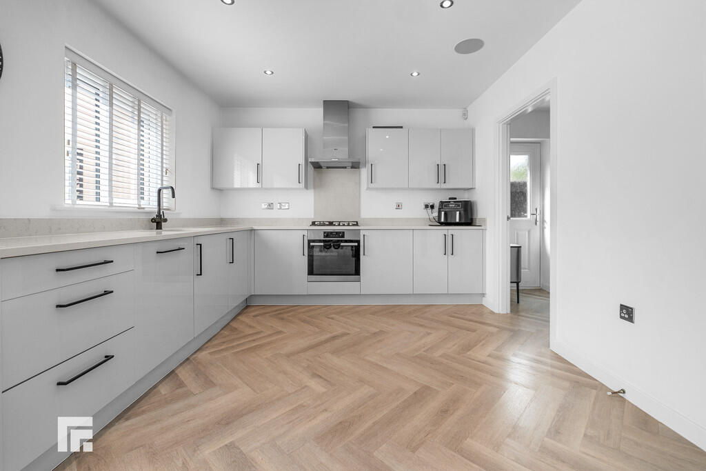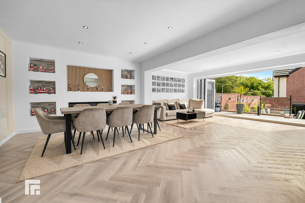 KITCHEN/DINER27' 1" x 12' 7" (8.26m x 3.85m) A beautifully extended kitchen/dining/family room with upgraded kitchen to include a wide range of base and eye level units incorporating inset one and a half bowl stainless steel, with complementary Quartz worktops over. Fitted electric oven with gas hob and extractor hood over. Integrated dishwasher. LVT flooring throughout. Feature electric fireplace. Fitted ceiling speakers. Spotlights. Two radiators. uPVC double glazed window to rear. Door to utility room and opening to family room.