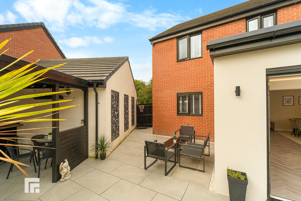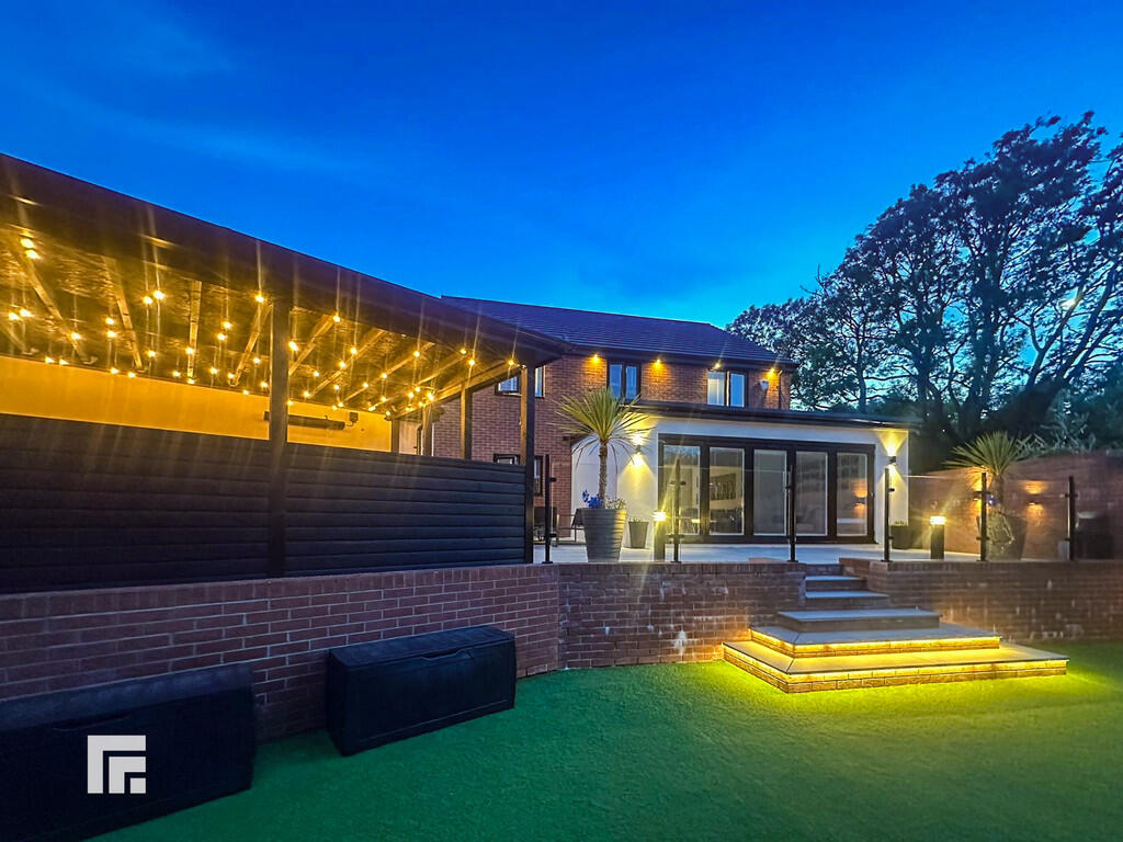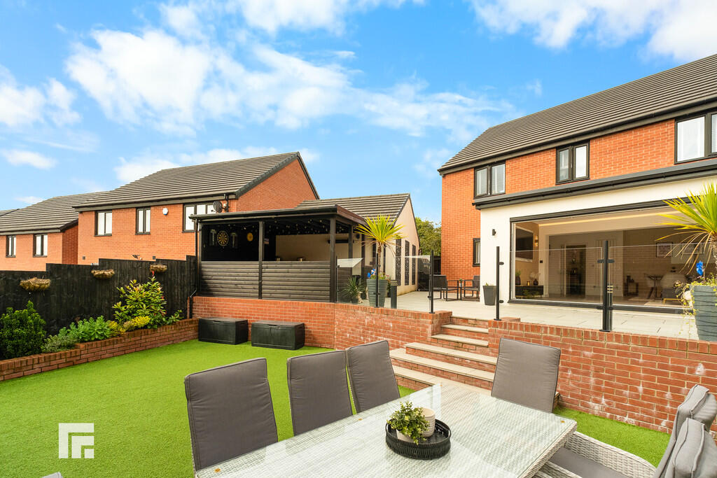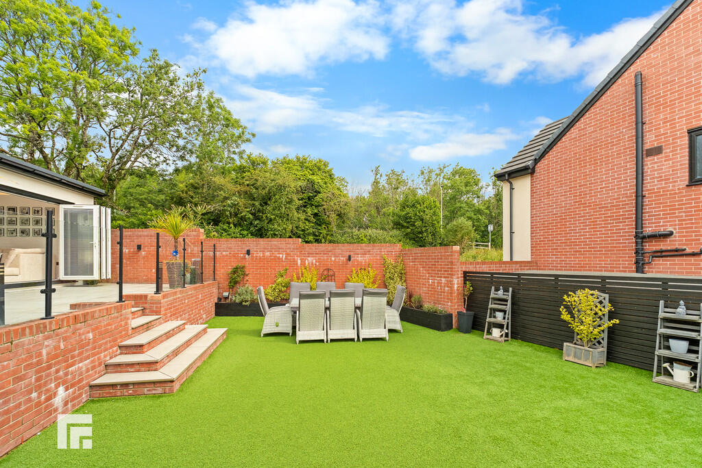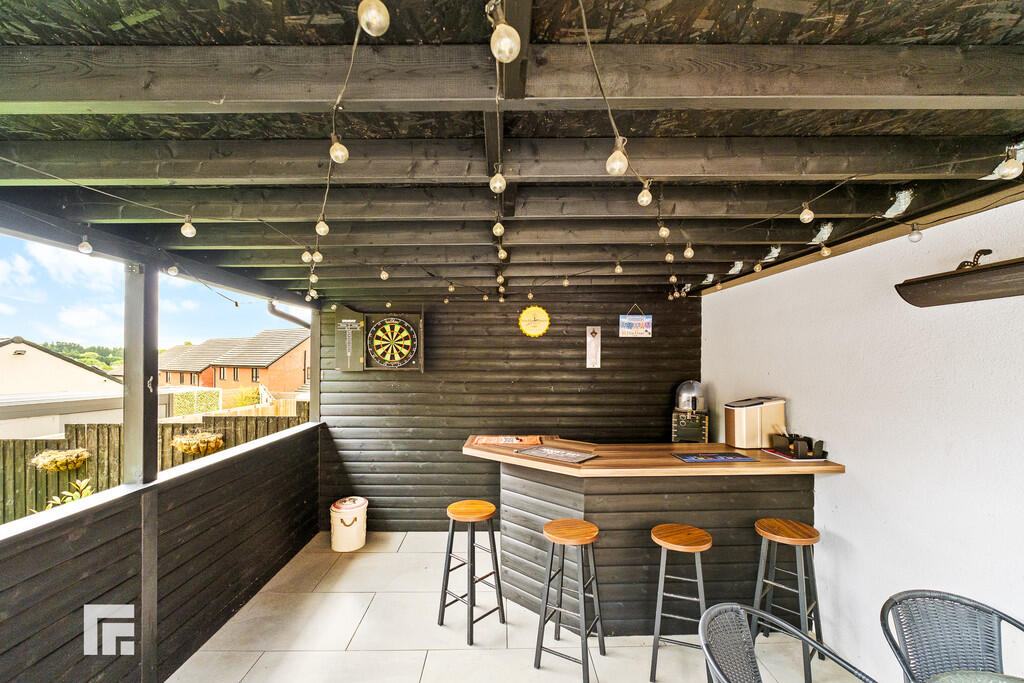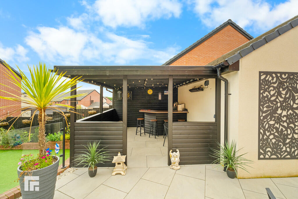 REARGARDEN A fully landscaped rear garden, a perfect spot for entertaining with Italian tiled patio off the kitchen/dinjng/family room with glass panels separating the lower level artificial lawn. Feature bar area with lean-to roof, continuation of the tiled flooring, light and power. Boundary wall and fencing with raised flower beds. External lighting and power points. Outside tap.