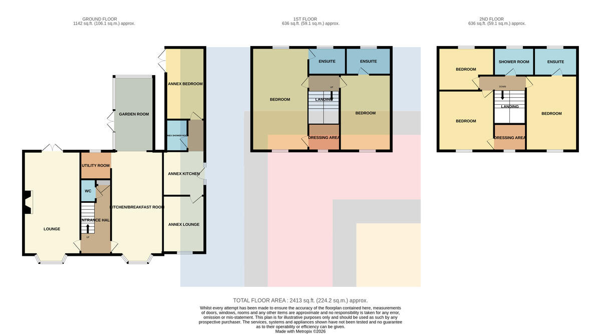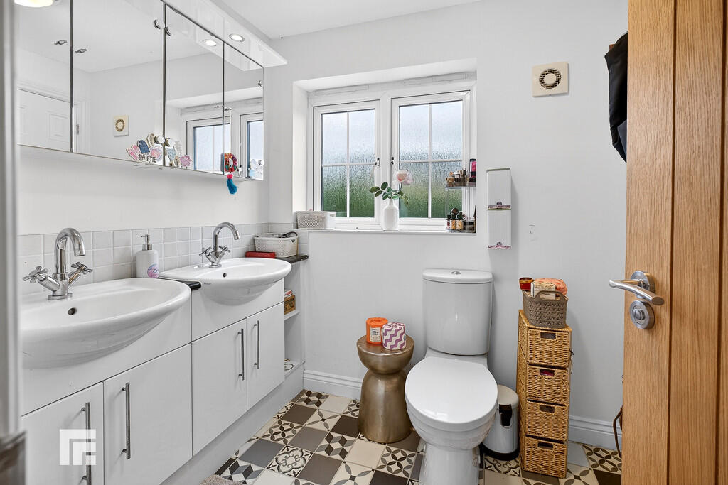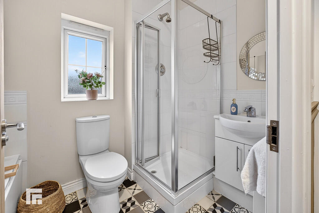 ENSUITETHREE9' 0" x 5' 6" (2.75m x 1.69m) A white suite comprising of low level wc, twin wash hand basin, ample storage below worktop. Large shower cubicle with chrome shower head above, sliding glass screen, tiles to splash back areas. Electric shaver points. Obscured glass window to rear. Decorative floor tiles. Radiator.