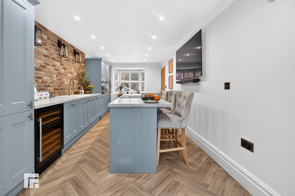 KITCHENANDBREAKFASTROOM23' 1" x 9' 9" (into bay)(7.04m x 2.98m) A delightful bay fronted kitchen and breakfast room with modern fitted 'Wren' kitchen well appointed along one side. Inset ceramic sink with side drainer. Integrated dishwasher. Integrated fridge freezer. Integrated two ovens, microwave and plate warmer below. Brick effect splashback to sink area. Large central breakfast bar island with inset four ring induction hob with a central extractor fan. Inset wooden shutters to bay window. Quality herringbone effect LVT flooring. Radiator. Opening to utility room and garden room.