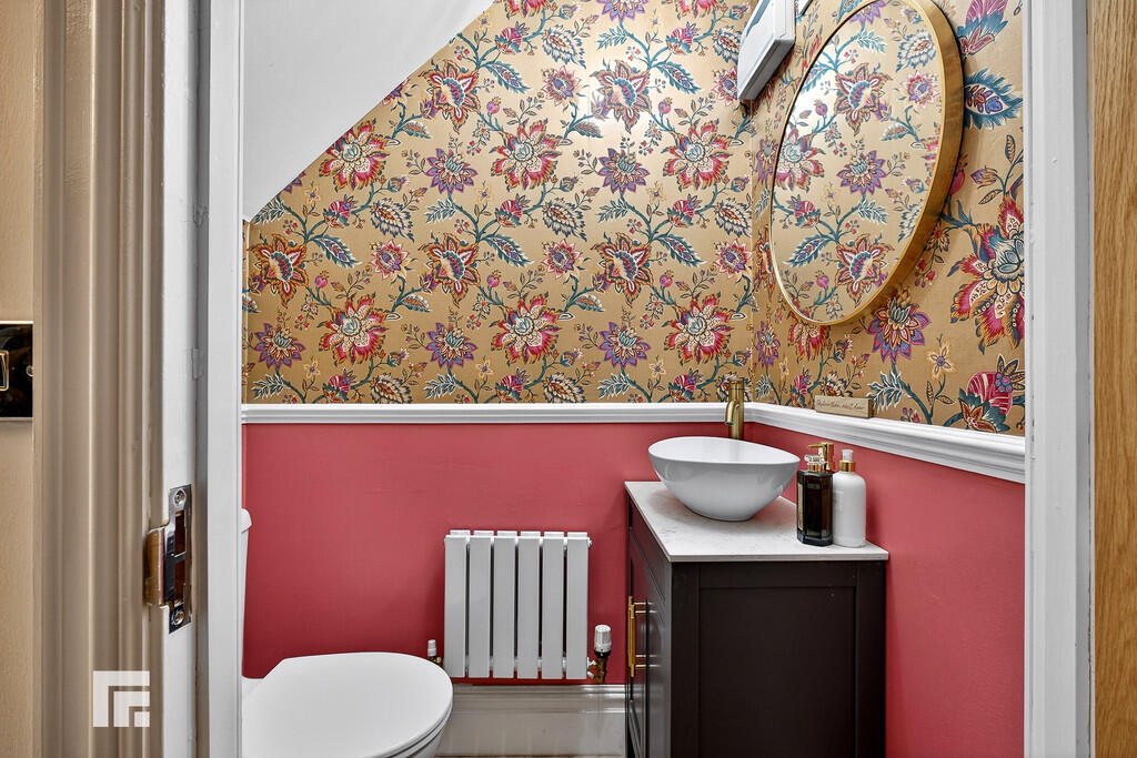 CLOAKROOM Quality white suite comprising low level wc and vanity wash basin with storage below. Quality herringbone effect LVT flooring. Extractor fan. Radiator.