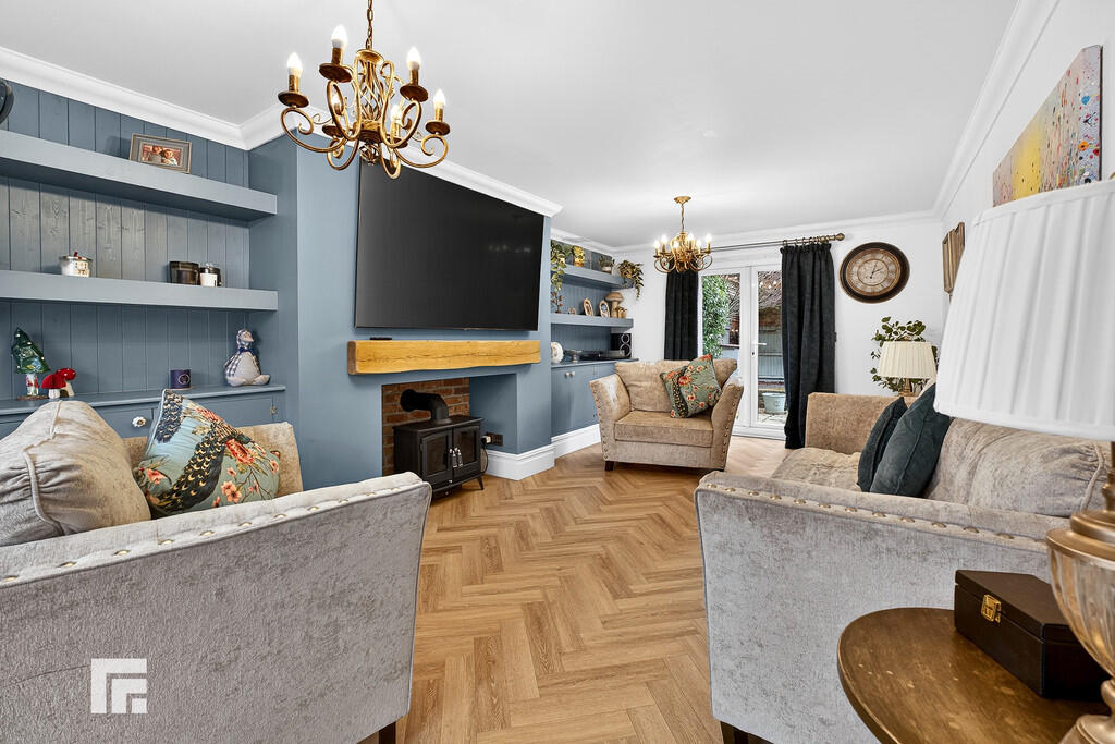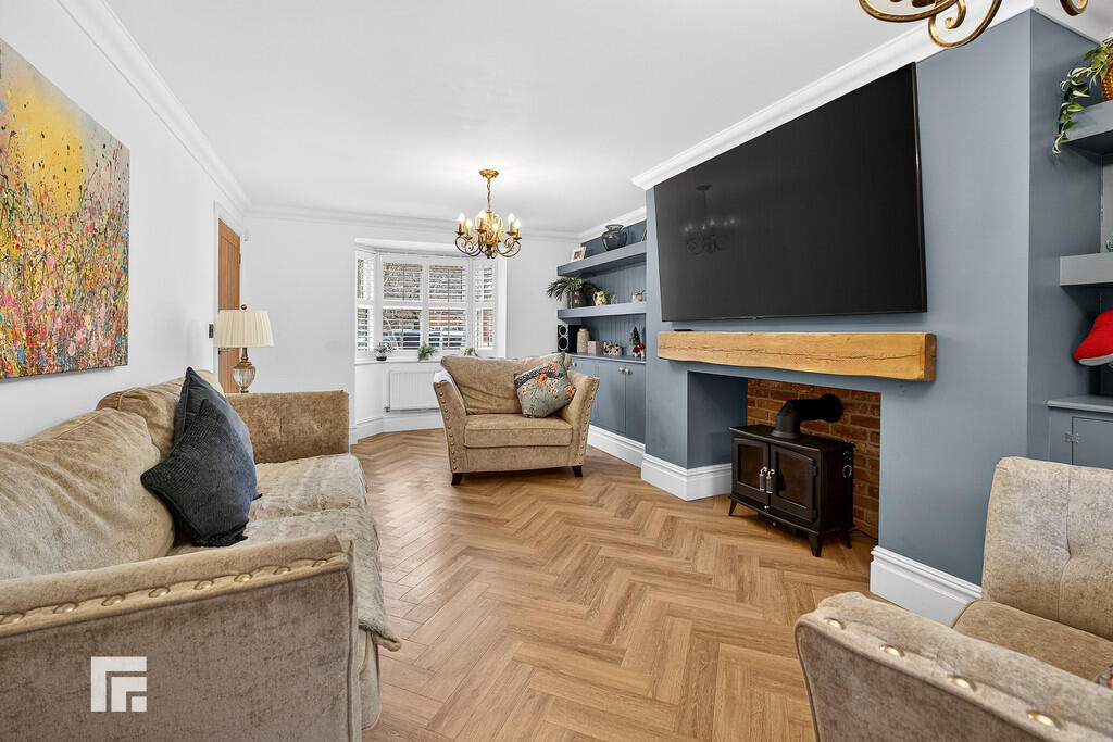 LOUNGE23' 1" x 11' 6" (into bay) (7.05m x 3.51m) A large bay fronted reception overlooking the central green with inset wooden shutters. Feature central chimney break with oak beam and storage with shelving to either side. French doors opening to rear garden. Quality herringbone effect LVT flooring. Two radiators.