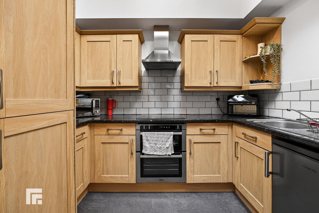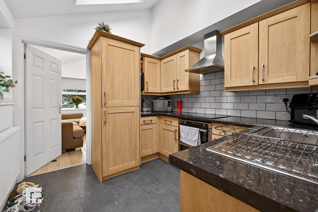 KITCHEN9' 4" x 8' 7" (2.87m x 2.63m) Well appointed along three sides in woodgrain finish fronts beneath laminate worktop surfaces. Inset stainless steel sink with side drainer. Inset four ring hob with cooker hood above and oven below. Matching range of eye level wall cupboards. Two velux windows. Radiator.