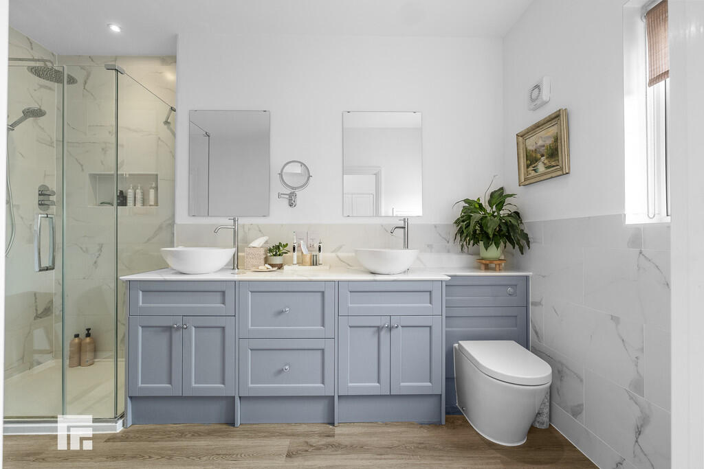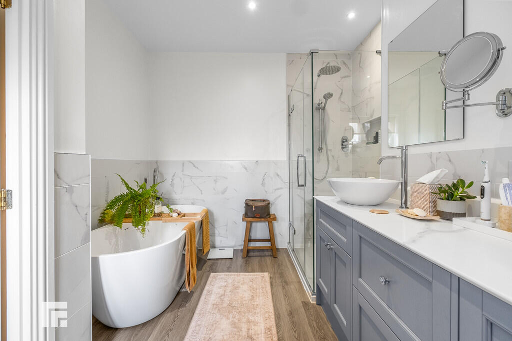 ENSUITE12' 0" x 8' 10" (3.67m x 2.71m) A quality white suite comprising of low level wc, vanity with twin wash hand basin, ample storage below marble worktop. Large walk in shower cubicle with twin chrome shower heads above, tiled recess storage for toiletries. half height tiles to splash back areas. Free standing bath with freestanding shower mixer tap. Recessed spotlights. LVT flooring. Two electric shaver points. Obscured glass window to rear. Heated towel rail. Under floor heating.