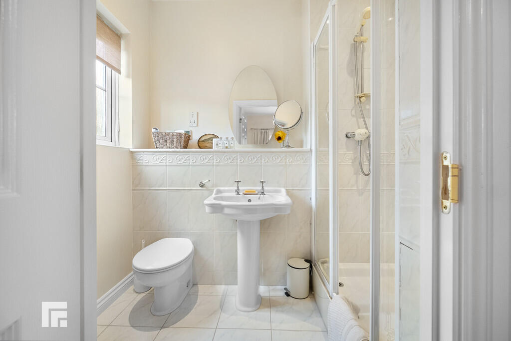 ENSUITETHREE7' 3" x 5' 2" (2.23m x 1.59m) A white suite comprising a low level wc, wash hand basin, full tiled shower cubicle with folding glass door. Tiled splashback areas. Tiled flooring. Obscured glass window to side. Electric shaving point. Extractor fan. Heated towel rail. Under floor heating.