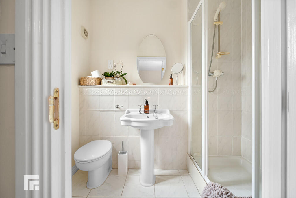 SHOWERROOM6' 3" x 6' 2" (1.91m x 1.88m) Modern white suite comprising low level wc, wash hand basin, corner shower cubicle. Tiled splashback back. Tiled flooring. Chrome heated towel rail.