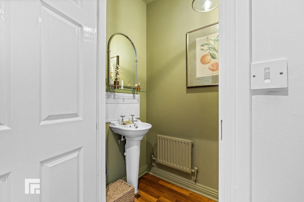 CLOAKROOM White suite comprising low level wc and wash hand basin. Tiled splash back. Wood flooring. Extractor fan. Radiator.