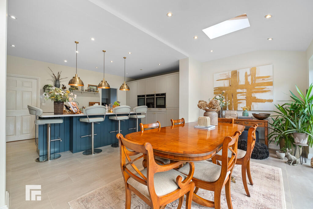 KITCHEN/DINER/FAMILYROOM21' 4" x 21' 0" (6.52m x 6.41m) An excellent sized open plan kitchen and family room with modern fitted 'Leekes' kitchen with shaker style units along three sides beneath marble worktop surfaces. Inset 1.5 bowl ceramic sink with worktop side drainer. Marble splash back to sink area. Two integrated 'Neff' ovens. Integrated 'Neff' microwave with warming drawer below. Two integrated fridge freezers. Integrated 'Neff' dishwasher. Integrated bin cupboard. Large central breakfast bar island with inset five ring 'Neff' induction hob, storage and room for four breakfast stool. Two pop up power points to the island. Ample space for family dining or seating area. Recessed spotlights throughout. Bi-folding doors to one wall opening to the exceptionally spacious rear garden. Amtico flooring. Double doors to sitting room. Door to utility room. Two radiators.