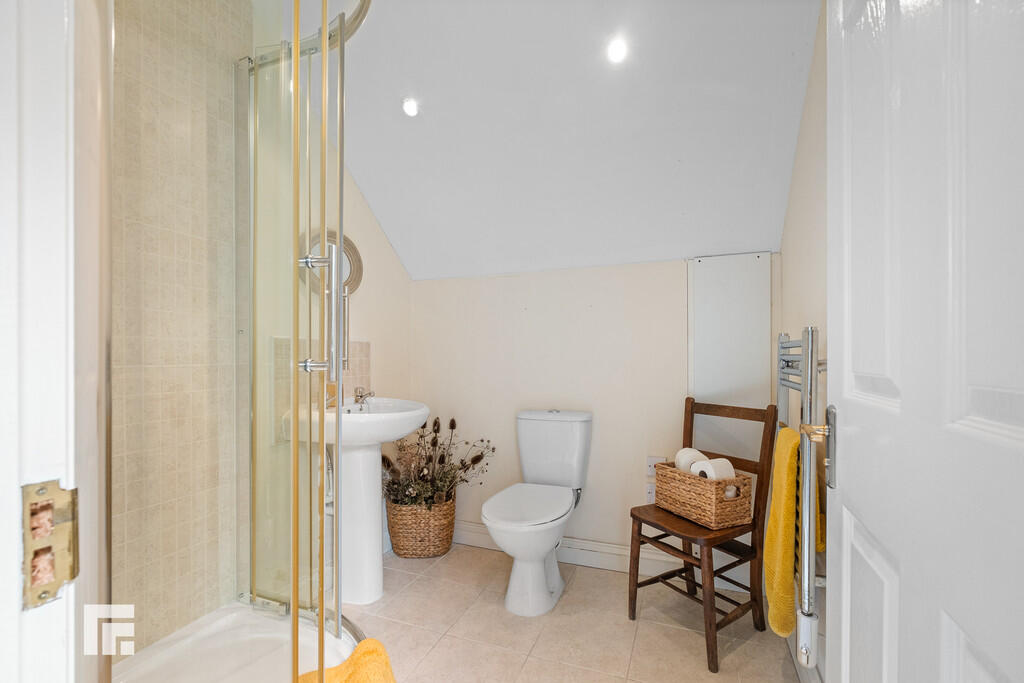 FAMILYSHOWERROOM10' 4"(max) x 5' 10" (3.16m x 1.79m) A white suite comprising of a low level wc, wash hand basin, a corner shower cubicle with twin shower head above, curved sliding glass doors. Tiled splashback areas. Tiled flooring. Door to storage cupboard. Velux window to rear. Recessed spotlights. Extractor fan. Heated towel rail. Under floor heating.