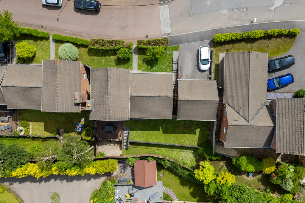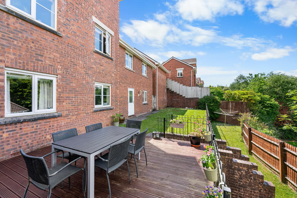 REAR An enclosed, spacious rear garden with two separate grass areas and decked seating area. Wooden gate with steps leading up to the front of the property. Outside tap and lighting.