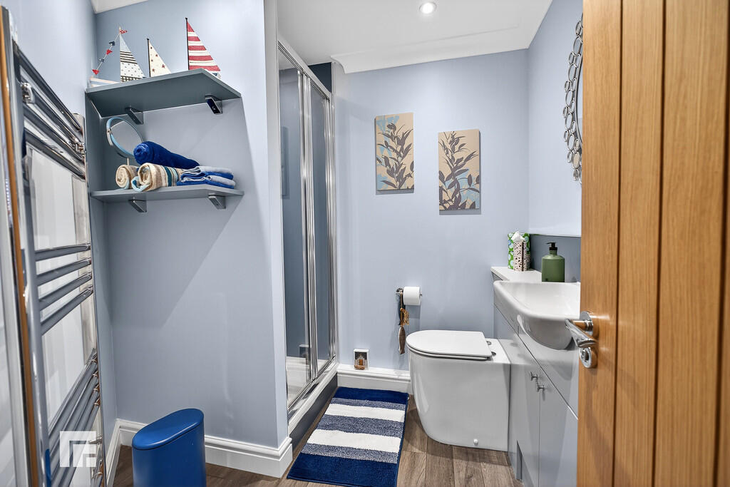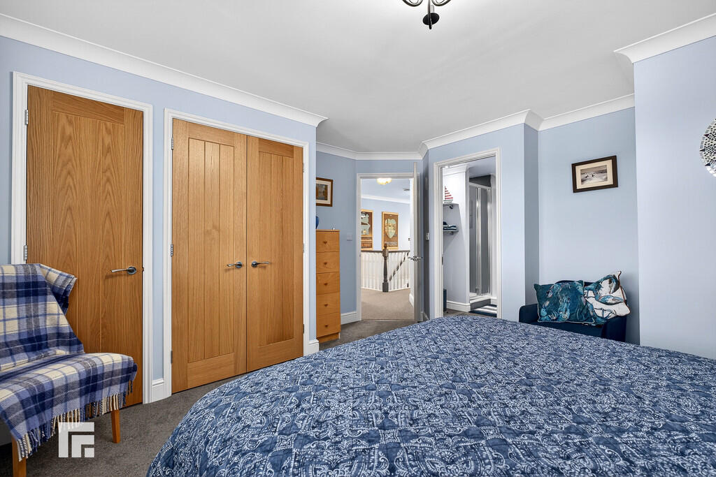 ENSUITE10' 6" x 6' 11" (3.22m x 2.12m) Quality white suite comprising of low level wc, vanity with twin wash hand basin, ample storage below. A sizeable walk in shower cubicle with twin chrome shower heads overhead. Full wall tiling. Recessed spotlights. Quality tiled flooring. Two electric shaver points. Obscured glass window to side. Heated towel rail.
