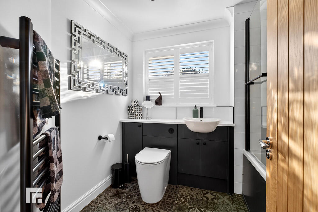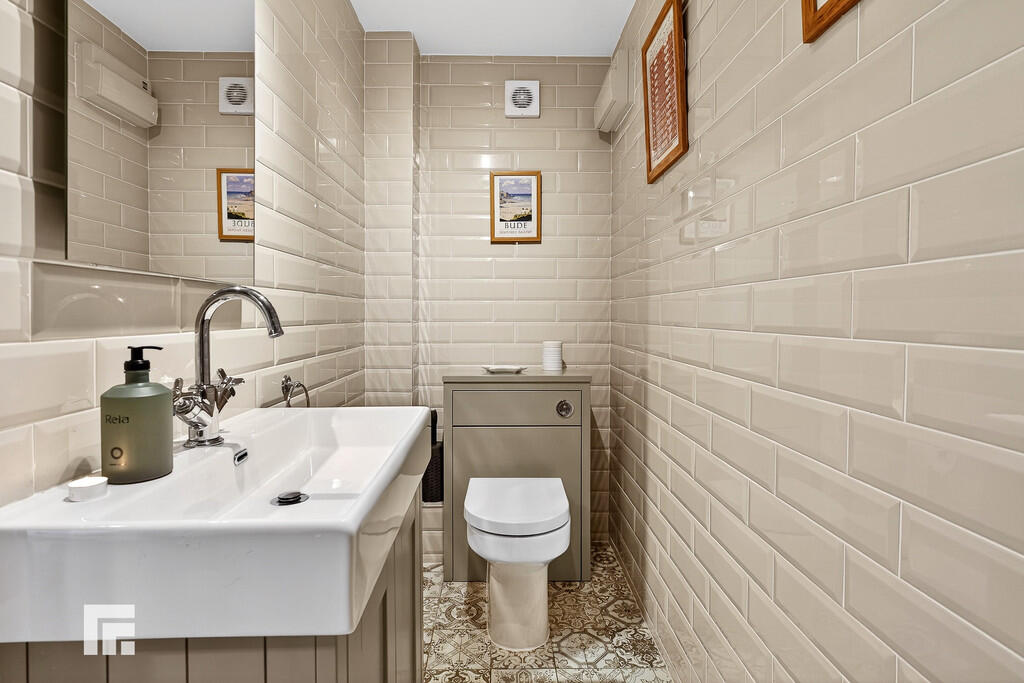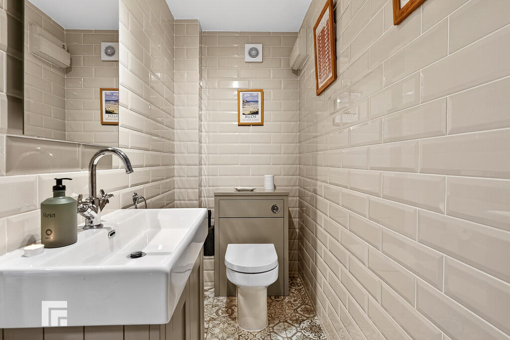 CLOAKROOM9' 8" x 3' 4" (2.97m x 1.04m) Modern white suite; low level WC, ceramic wash hand basic with chrome miser tap and vanity. Modern chrome radiator. Patterned tiled flooring. Full wall tiling. Extractor fan.