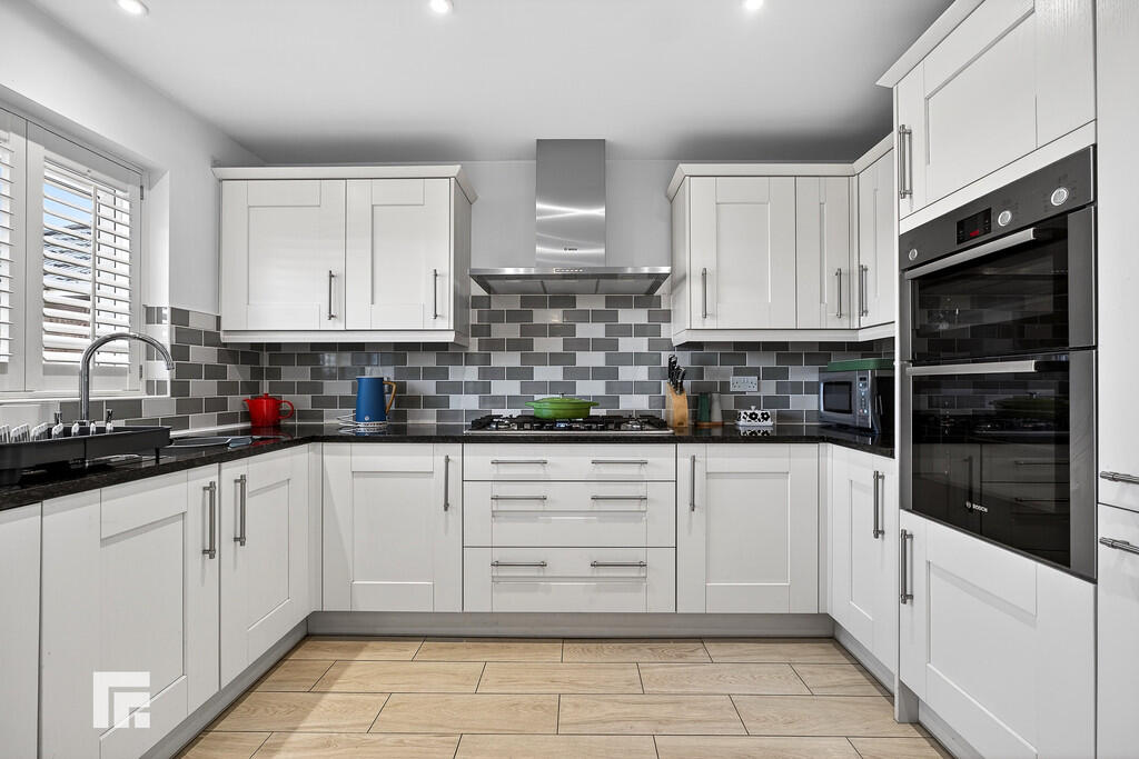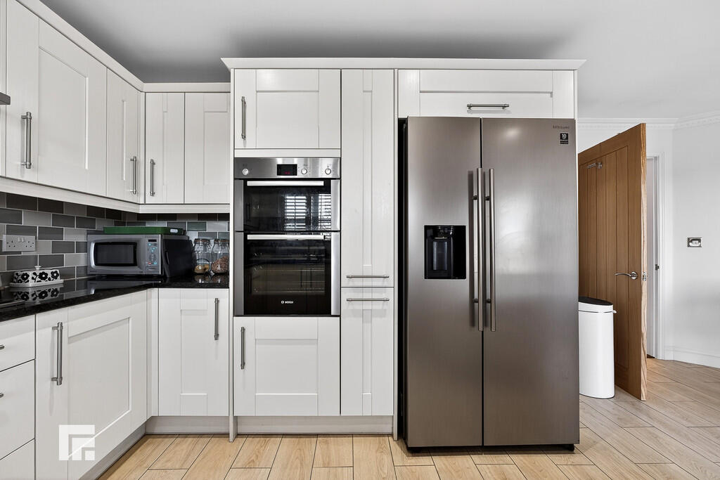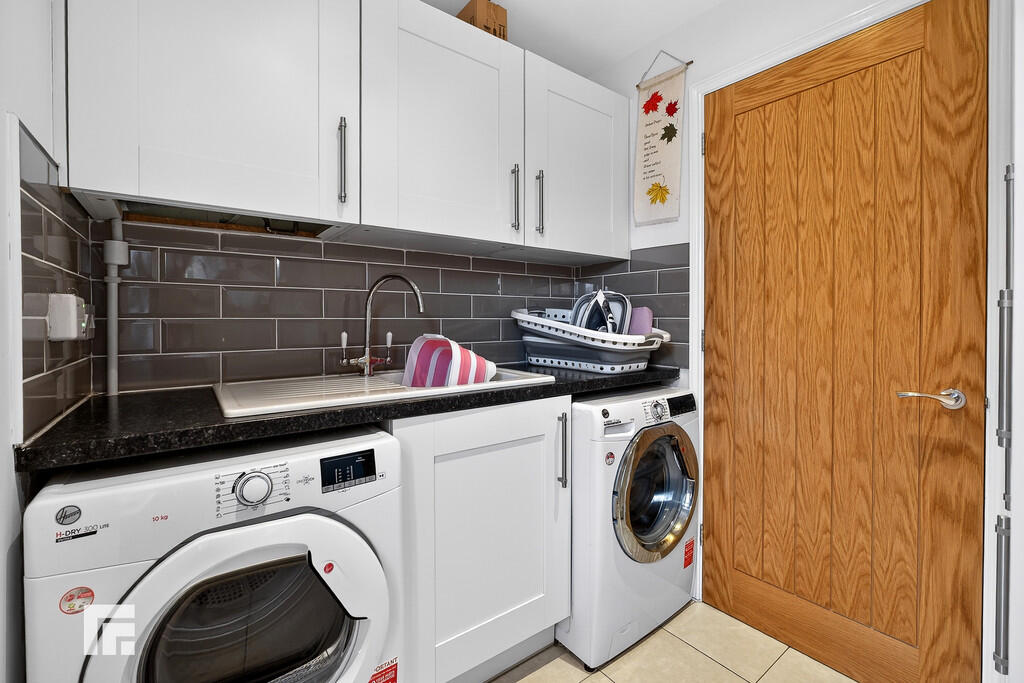 UTILITYROOM7' 0" x 6' 0" (2.15m x 1.85m) Appointed along one side, high and low level shaker style cabinets beneath a laminate worktop, ceramic sink with chrome mixer tap and side drainer, integrated fridge freezer with additional cupboard to side. Plumbing for washing machine. Space for tumble dryer. Concealed 'Valliant' boiler. Chrome heated towel rail. Extractor fan. Spotlights. Tiled flooring and splashback. uPVC door to side.