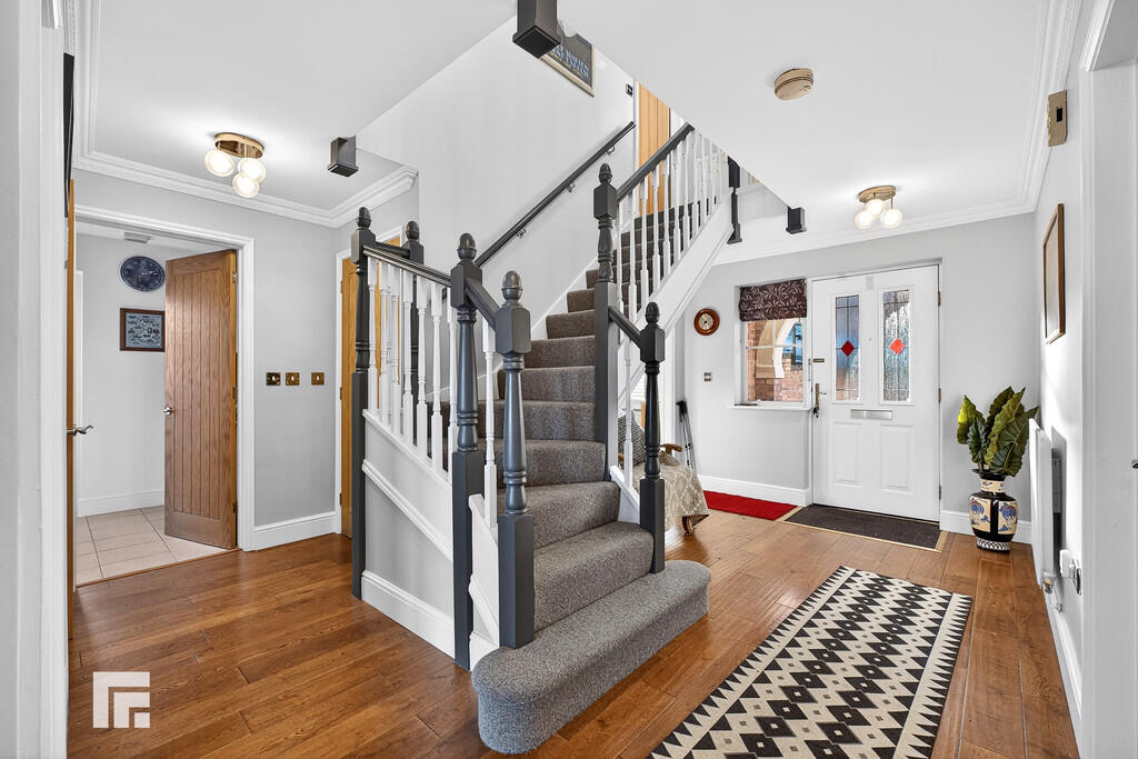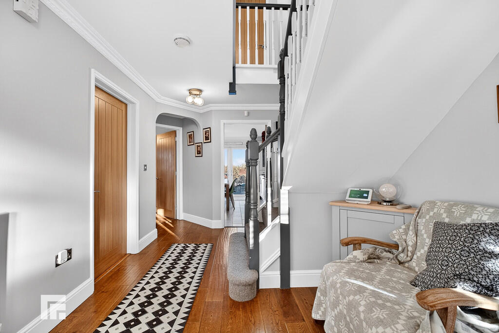 HALLWAY Entered via a wooden door with stain glass panels and side uPVC window, a welcoming, spacious hallway. Radiator. Sold wood flooring. Built in double oak doored storage cupboard. Half turning spindled staircase leading to the first floor. Oak doors to all rooms.