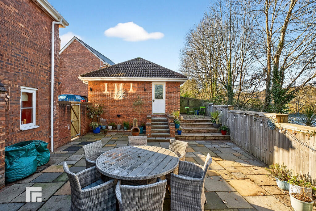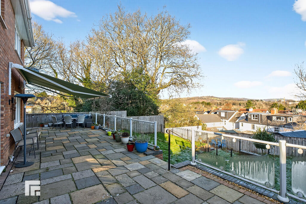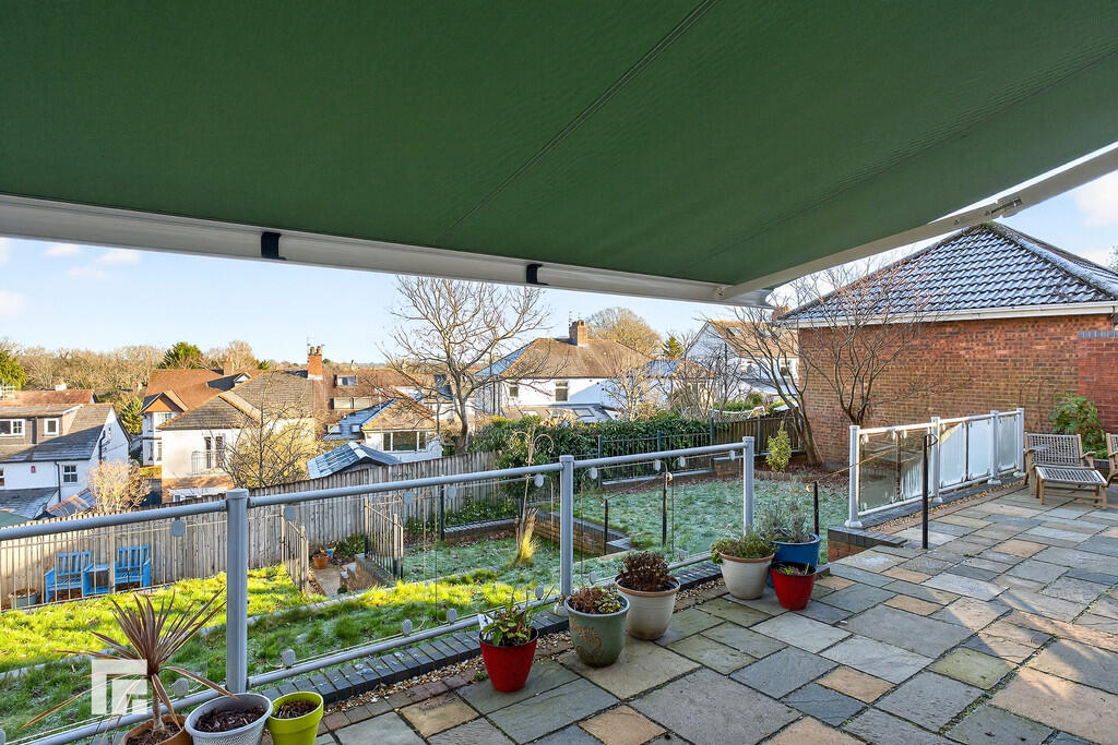 REARGARDEN A large, wrap around garden. Stone paved patio wraps around both sides creating a further patio seating area. Glass balustrade. Electric awning with outside wall heater. A few steps leading to large area laid to lawn with metal balustrade. Tiled steps leading to the rear of the garage for a quaint, outside, private dining area. A further paved area offers additional space for outside dining. Brick planters to one side leading to timber gate for side access. Additional timber gate to side for access to front. Three outside power sockets. Outside tap. Bordered by a timber fence and wall to one side.
