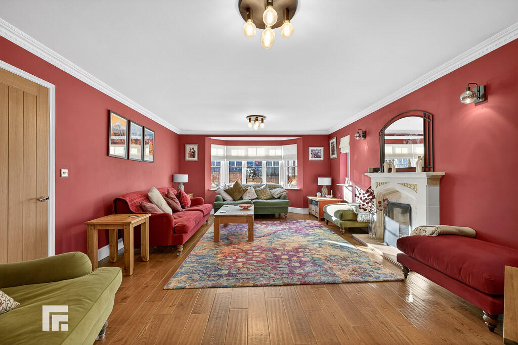 A large, beautifully presented family lounge. Feature gas fireplace with marble mantle piece and hearth. Solid wood flooring. Two radiators. Large bay window to front. Two additional uPVC windows to side. Archway through to dining room.