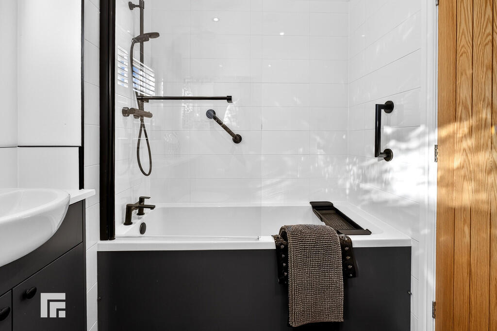 FAMILYBATHROOM7' 8" x 6' 5" (2.35m x 1.98m) A quality white suite comprising of low level wc, wash hand basin with ample storage below. Panelled bath with twin shower heads above. Tiles to splash back areas. Recessed spotlights. Obscured glass window to side. Heated towel rail.