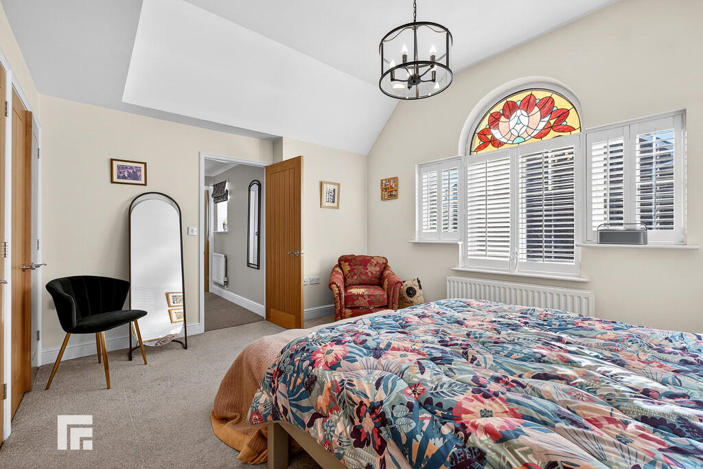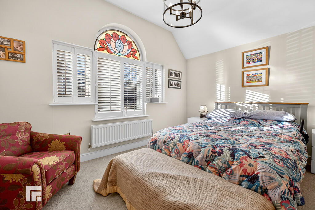 BEDROOMONE14' 10" x 11' 8" (4.53m x 3.56m) An excellent sized primary bedroom overlooking the entrance approach with a feature stained glass window. Three built in wardrobes appointed along one wall. Door to ensuite. Radiator.