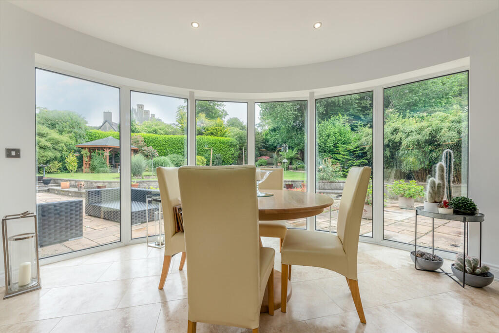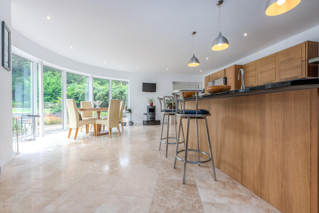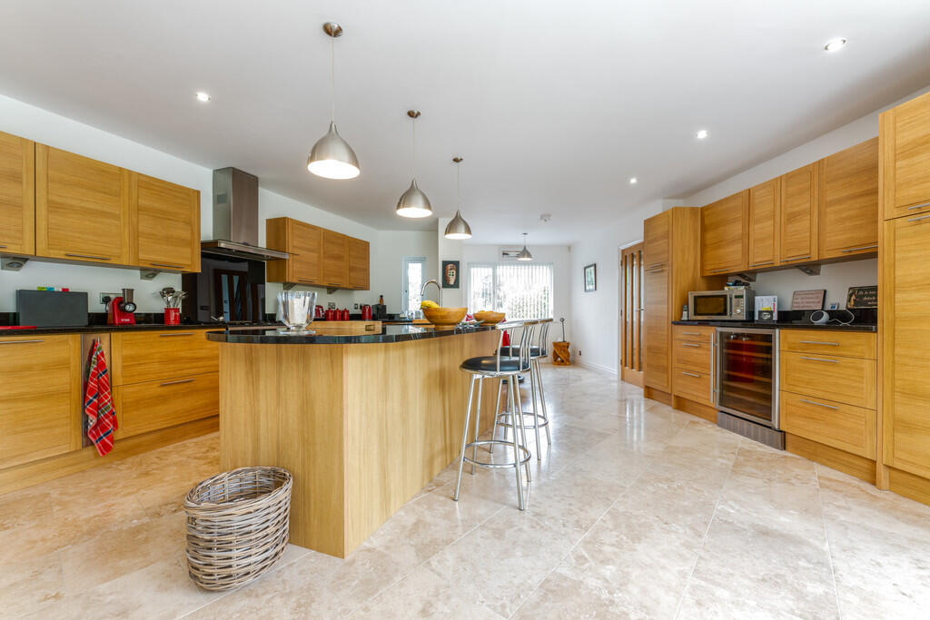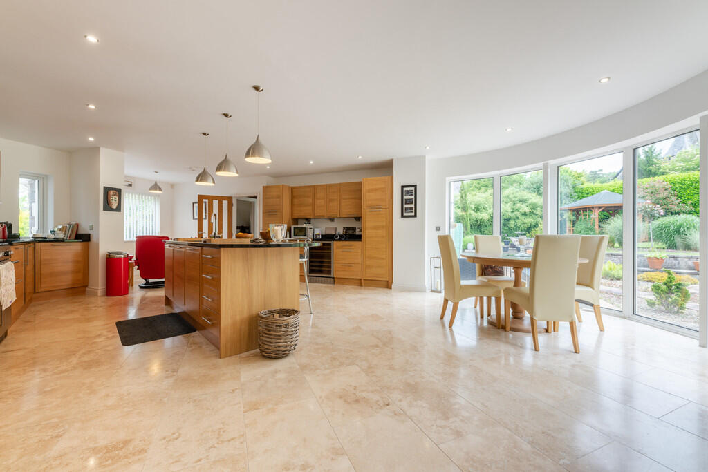 KITCHEN/BREAKFAST/FAMILYROOM32' 3" x 20' 9" (9.85m x 6.35m) An exceptional kitchen/breakfast/family room which provides the perfect entertaining space. The bespoke kitchen is fitted with a wide range of base and eye level units with feature central island incorporating one and a half bowl inset stainless steel sink and stunning granite work surfaces. Space for range cooker with extractor hood over. Space for American fridge freezer. Integrated dishwasher and drinks cooler. Travertine tiled flooring with underfloor heating. Stunning six leaf double glazed curved window overlooking the garden. Spotlights. Two uPVC double glazed windows to front. Door to utility room and glazed double doors to garden room.