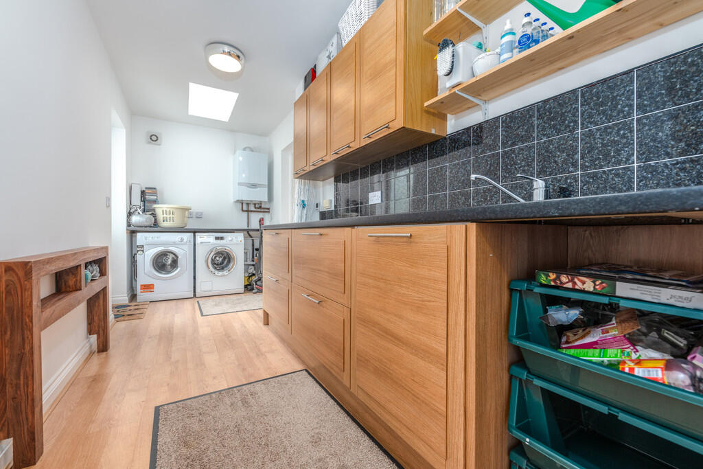 UTILITYROOM17' 1" x 5' 11" (5.22m x 1.82m) Fitted with bespoke base and eye level units with stainless steel sink and drainer and complementary work surfaces. Tiled splash backs. Laminate wood flooring. Space for washing machine and tumble dryer. Wall mounted gas central heating boiler. Extractor fan. Double glazed velux window to side and external door to rear. Door to double garage.