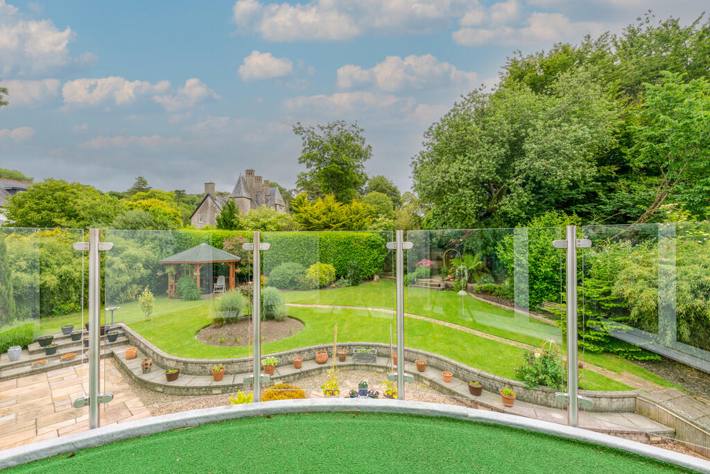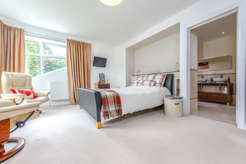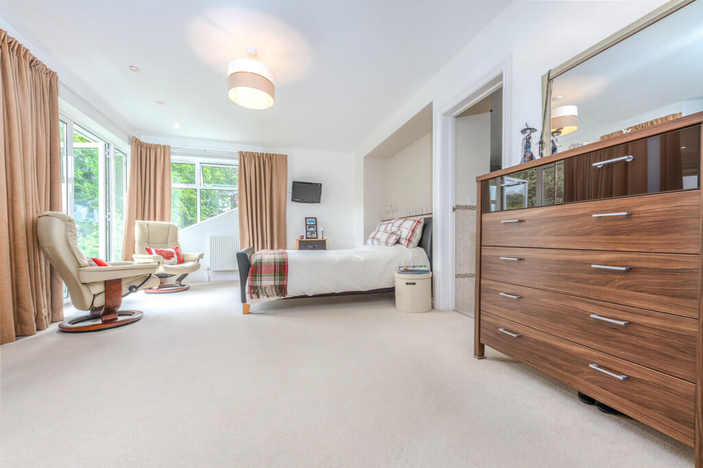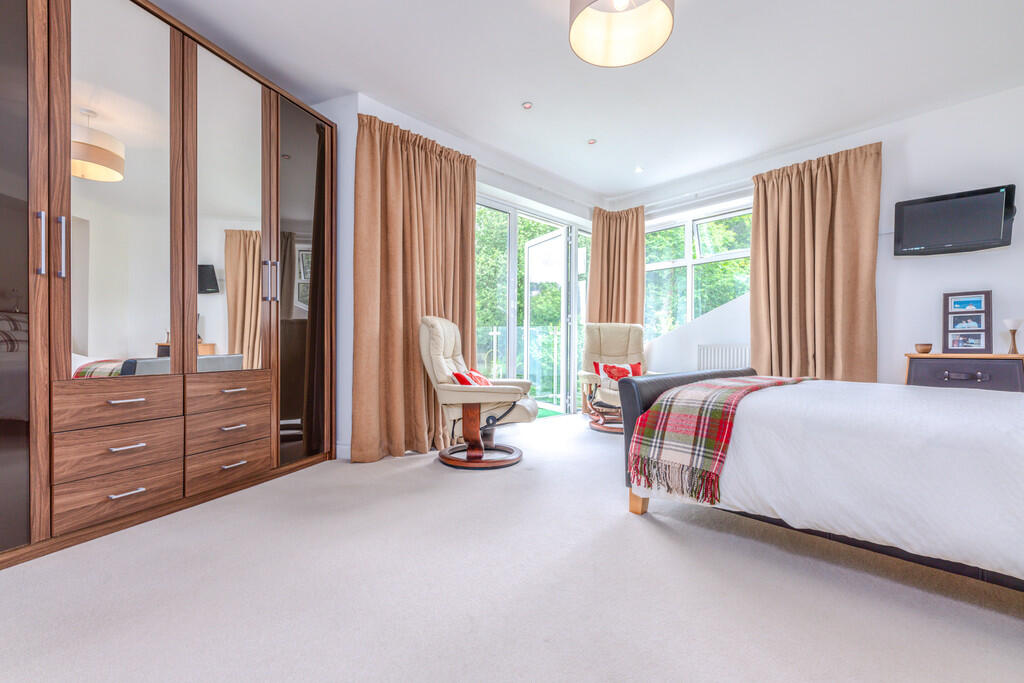 BEDROOMONE18' 10" x 13' 7" (5.76m x 4.16m) Feature window to rear and double doors to side balcony providing stunning views over the garden. Fitted wardrobes to one wall. Radiator. Spotlights. Door to: