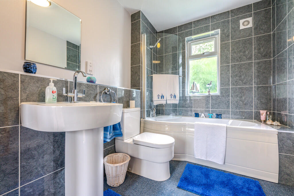 BATHROOM11' 0" x 6' 10" (3.36m x 2.09m) Another spacious room with suite comprising low level WC, pedestal wash hand basin and panelled 'P' bath with shower over and glass screen. Tiled splash backs. Radiator. Extractor fan. uPVC double glazed window to rear.