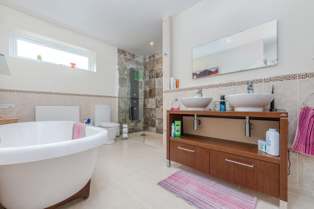 EN-SUITE12' 4" x 11' 6" max (3.77m x 3.51m) A luxury en-suite bathroom to include vanity unit with double wash hand basins, free standing bath and walk-in modern shower with separate attachment and glass screen. Tiled flooring and splash backs. Ladder radiator and towel rail. uPVC double glazed window to rear. Spotlights.