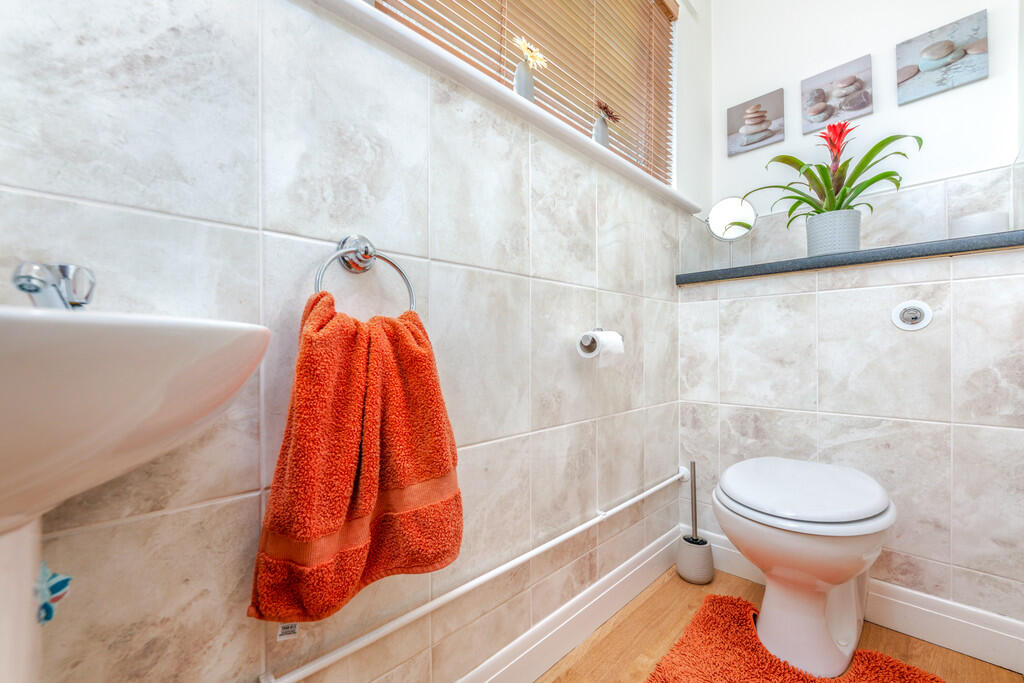 CLOAKROOM7' 10" x 6' 2" (2.40m x 1.88m) Low level WC and pedestal wash hand basin. Laminate wood flooring. Tiled splash backs. uPVC double glazed window to front. Radiator. Hanging rail.