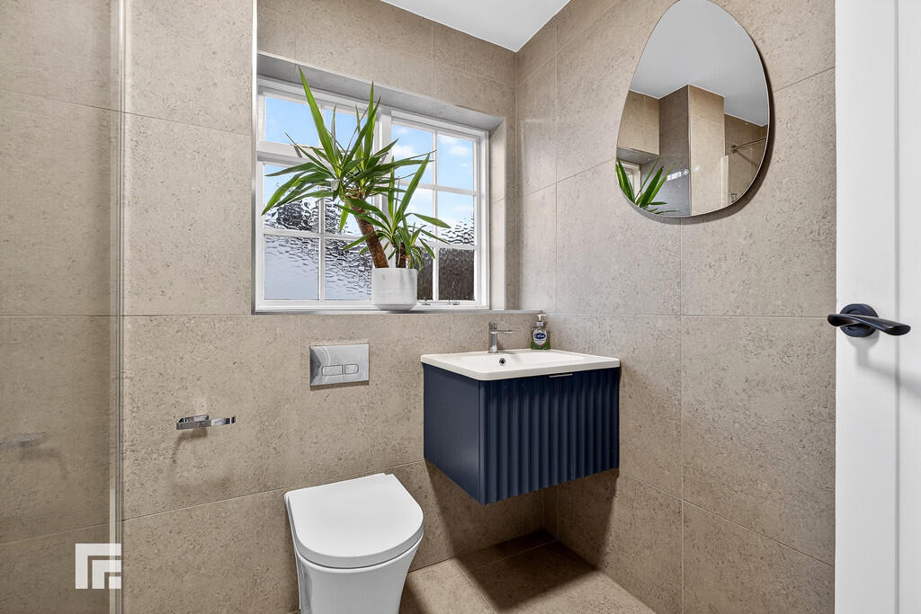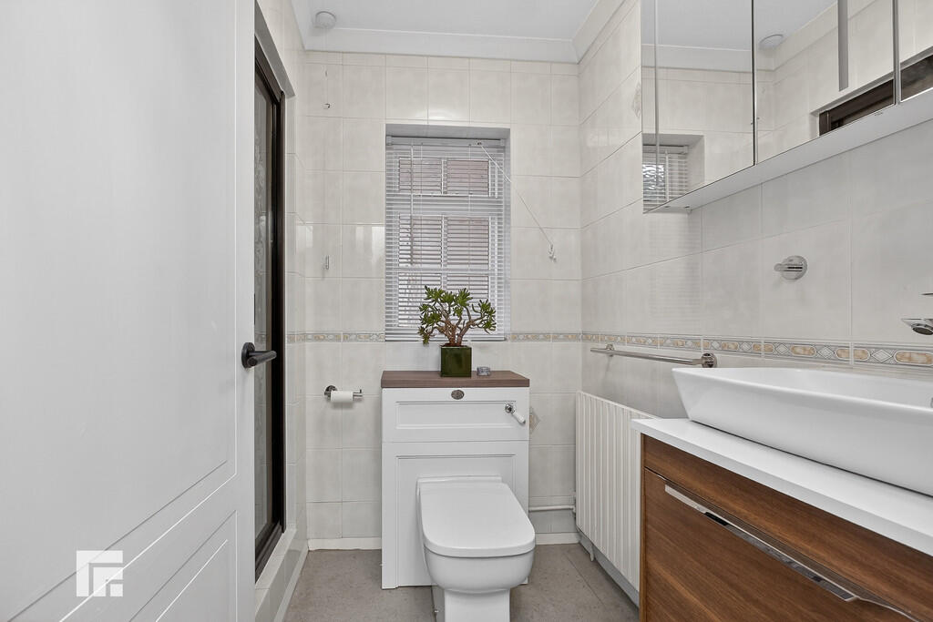 SHOWERROOM Modern white suite comprising low level wc, vanity wash basin with storage below and shower cubicle with chrome shower above. Full wall tiling. Tiled flooring. Obscured glass window. Radiator.