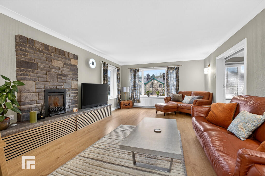 LOUNGE19' 5" x 13' 2" (5.94m x 4.02m) With windows to front and side, an excellent sized primary reception. Feature stone fireplace. Laminate flooring. Radiator. Sliding doors leading to dining room.
