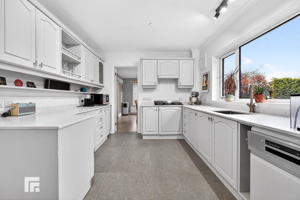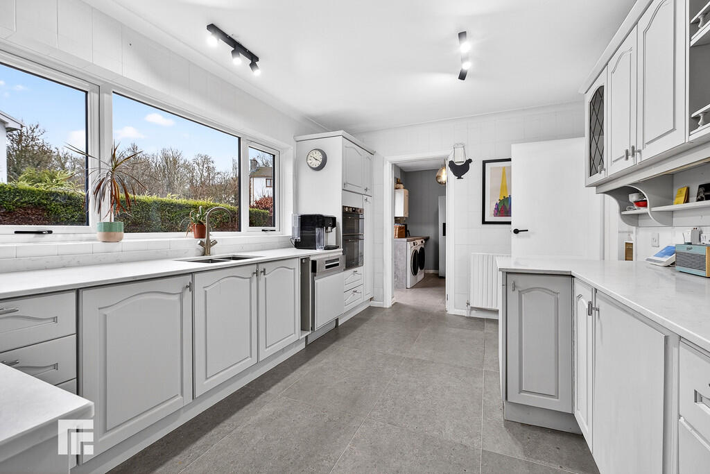 KITCHEN14' 0" x 9' 10" (4.28m x 3.02m) Well appointed along three sides in light panelled fronts beneath quartz worktop surfaces. Inset 1.5 bowl with worktop side drainer. Inset five ring gas hob with concealed cooker hood above. Integrated oven and grill. Integrated dishwasher. Matching range of eye level wall cupboards. Tiled splash back. Tiled flooring. Large window overlooking the rear Keyblock patio. Radiator. Doors to hallway, dining room and utility room.